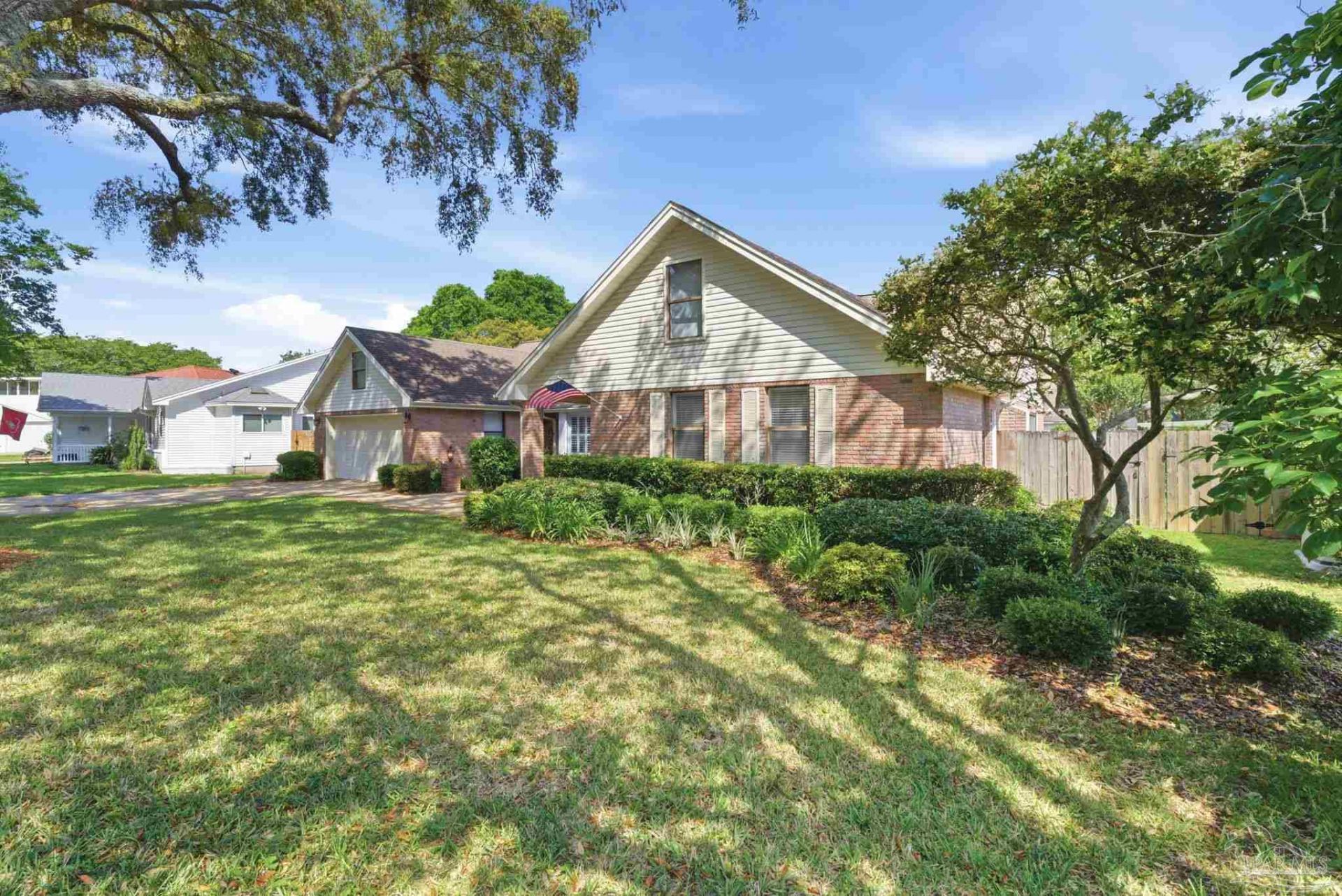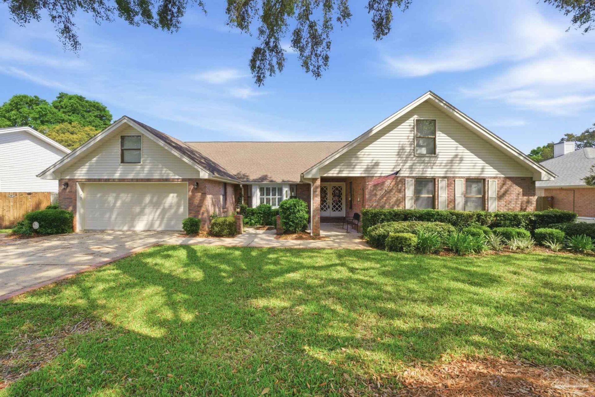 Beautiful one-story home in the desirable La Mirage subdivision offering 3 bedrooms and 2.5 baths with a spacious, open floor plan designed for comfortable living and easy entertaining. The welcoming foyer features classic brick flooring and opens into a light-filled living area complete with a wet bar. The kitchen provides a bright, functional layout with a breakfast area, gas range, large pantry, and a generously sized laundry room with ample storage. The primary suite offers a vaulted ceiling, creating an airy and relaxing retreat. Just off the kitchen, a versatile sunroom overlooks the backyard and pool-currently used as an office but ideal as a playroom, second living area, or flex space. Step outside to enjoy the private backyard featuring mature landscaping, a pool with a brand new liner, and a covered area perfect for outdoor gatherings. Additional highlights include a detached storage shed and well-designed indoor and outdoor living spaces. Conveniently located near Pensacola International Airport, major medical facilities, shopping, and dining, and approximately 15 minutes from downtown Pensacola, this home offers both comfort and accessibility in a sought-after location.